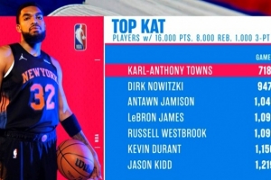 唐斯在生涯第718場達成,比此前用時最短的諾維茨基少了229場!