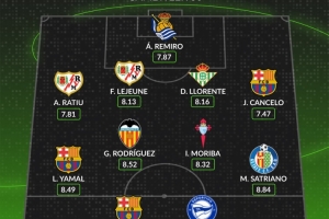 WhoScored西甲第30輪最佳陣:亞馬爾、奧爾莫、坎塞洛在列