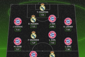 中場:奧利塞(拜仁,7.97分)、巴爾韋德(皇馬,7.29分)、卡爾(拜仁,7.43分)、迪亞斯(拜仁,7.80分)