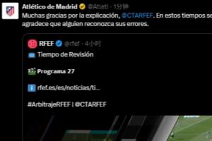 馬競(jìng)官方賬號(hào)轉(zhuǎn)發(fā)了這一評(píng)議視頻,并表示:“非常感謝您的解釋。@西班牙裁委會(huì) 在如今這個(gè)時(shí)代,能夠承認(rèn)錯(cuò)誤的人是值得稱贊的。”