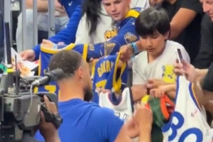 賽前勇士給場(chǎng)邊的球迷們簽名互動(dòng),場(chǎng)面火爆。