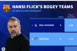 弗里克執(zhí)教巴薩以來克星排名(至少對陣3場):