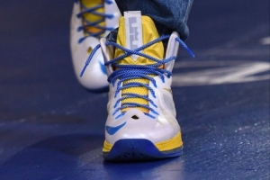 體育資訊4月10日訊 勇士主場迎戰湖人,庫里今天穿著詹姆斯經典戰靴LeBron 10入場。