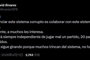 體育資訊4月11日訊 皇馬TV主持人David álvarez更新社媒,表達了對皇馬1-1赫羅納比賽中判罰的不滿。