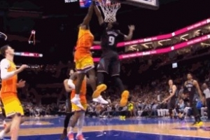 GIF-新秀詹姆斯隔扣奧薩爾被犯規 活塞挑戰成功