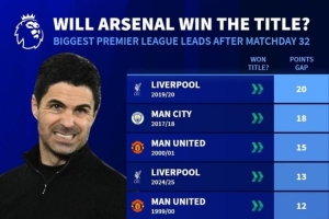 英超歷史32輪后至少領先8分球隊,此前全部最終奪冠: