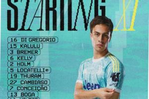尤文首發(fā):16-迪格雷戈里奧、15-卡盧盧、3-布雷默、6-凱利、2-霍爾姆、5-洛卡特利、19-K·圖拉姆、27-坎比亞索、7-孔塞桑、13-博加、10-伊爾迪茲