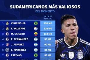 體育資訊4月12日訊 德國轉會市場列出了南美球員身價排名,維尼修斯1.5億歐居首,巴爾韋德1.2億歐次席。