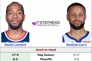 據統計,倫納德常規賽對陣庫里17勝9負,季后賽8勝5負。