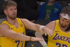 比賽中鏡頭給到場邊,兩名球迷形似東契奇和蒂米,山寨版東契奇翩翩起舞,非常忘我。