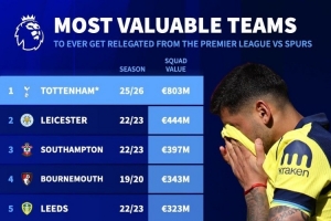 體育資訊4月13日訊 據(jù)德國轉(zhuǎn)會市場統(tǒng)計(jì),如果熱刺本賽季降級,將成為英超歷史上身價(jià)最高的降級球隊(duì)。