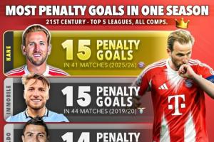 本世紀單賽季點球進球榜:凱恩41場15球居首,C羅、梅西14球次之