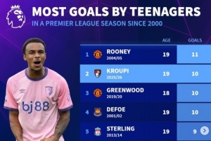 體育資訊4月13日訊 伯恩茅斯在本輪英超爆冷2-1擊敗阿森納,小將克魯皮取得進球。數(shù)據(jù)統(tǒng)計顯示他有望打破魯尼保持的一項新世紀英超單賽季U20進球紀錄。
