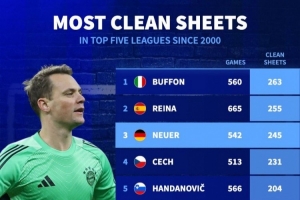 體育資訊3月27日訊 德國轉會市場統計了2000年以來五大聯賽門將零封場次,并列出榜單,布馮263場居首,雷納、諾伊爾排名二三位。