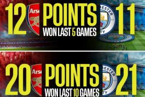 有媒體列出了兩隊(duì)近5輪、10輪以及20輪的積分對(duì)比,結(jié)果阿森納近5輪積分比曼城多1分,近10輪、20輪積分則比曼城少1分。