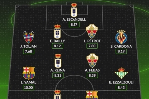 體育資訊4月14日訊 西甲第31輪戰罷,數據網站Whoscored也評選出本輪比賽評分最高陣容,其中亞馬爾滿分10分領銜,具體如下: