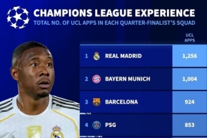 體育資訊4月15日訊 歐冠八強戰將戰火重燃,《轉會市場》也列出了當前各隊陣容中的總歐冠出場次數情況,皇馬、拜仁、巴薩列前三。