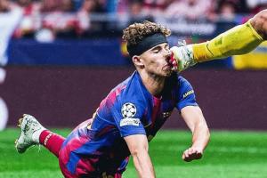 體育資訊04月15日訊 歐冠1/4決賽次回合,馬競vs巴薩,第26分鐘,費(fèi)爾明頭球攻門,隨后被穆索踢到頭部,倒地撞向地面,當(dāng)場血崩!