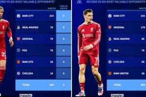 德轉數據統計顯示,本賽季代表利物浦出戰身價最高的6個對手(曼城、皇馬、巴黎、阿森納、曼聯、切爾西),維爾茨(共計659分鐘)和?;倏耍ü灿?94分鐘)僅收獲0球0助攻: