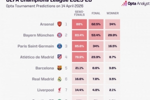 OPTA對拜仁、阿森納等隊的晉級概率進行了預測,拜仁晉級概率83.4%,阿森納晉級概率88%,也就是說皇馬的晉級概率僅為16.6%,葡萄牙體育則低至12%。
