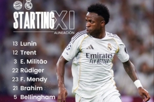 皇馬首發:13-盧寧、12-阿諾德、3-米利唐、22-呂迪格、23-費蘭·門迪、21-布拉欣·迪亞斯、5-貝林厄姆、8-巴爾韋德、15-居萊爾、10-姆巴佩、7-維尼修斯