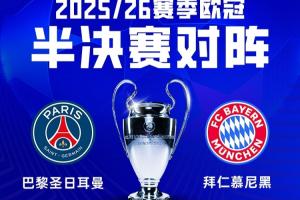 歐冠半決賽兩回合對陣將于北京時間4月29日、5月6日進行;巴黎先主后客,拜仁先客后主。