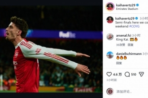 阿森納球員哈弗茨社媒曬出慶祝的照片,配文:“半決賽我們來了,迎接一個重要的周末。”