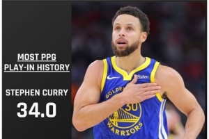 據統計,庫里生涯合計打了5次附加賽,場均能得到34分4.8籃板3.6助攻5.6三分,三項命中率分別是48.2%、50%和94.4%。