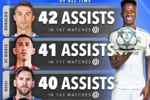 體育資訊04月16日訊 歐冠1/4決賽次回合,皇馬3-4總比分4-6不敵拜仁被淘汰,維尼修斯助攻姆巴佩破門,據統計這是維尼修斯在歐冠的第31次助攻,升至歷史第5。