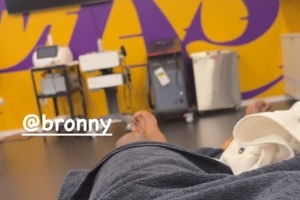 詹姆斯曬出他和兒子布朗尼都早早(洛杉磯時間早上8點40點左右)來到湖人訓(xùn)練館的理療師接受理療并準(zhǔn)備參加訓(xùn)練的自拍畫面,并寫道:“早起的鳥兒??有蟲??吃!@布朗尼”
