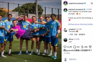 體育資訊4月18日訊 巴薩門將什琴斯尼今日迎來36歲生日,球隊在訓練場上也擺出造型為其慶祝生日。