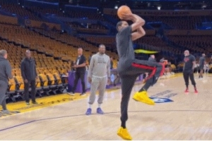 賽前,杜蘭特進(jìn)行熱身,看來(lái)膝蓋傷勢(shì)并不嚴(yán)重。