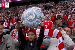 體育資訊04月20日訊 德甲第30輪,拜仁慕尼黑vs斯圖加特。上半場(chǎng)拜仁已取得3-1的領(lǐng)先,距離德甲提前奪冠近在咫尺。看臺(tái)上心情愉悅的小球迷高舉沙拉盤(pán)抱枕。
