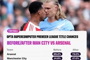 但OPTA超算仍然看好槍手最終奪冠,在本場比賽之前,阿森納奪冠概率高達85.2、曼城僅14.8%。而在客場失利之后,槍手的奪冠概率依然高達73%、曼城僅上升至27%。