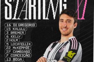 尤文首發:16-迪格雷戈里奧、15-卡盧盧、3-布雷默、6-凱利、2-霍爾姆、5-洛卡特利、22-麥肯尼、27-坎比亞索、7-孔塞桑、13-博加、30-戴維