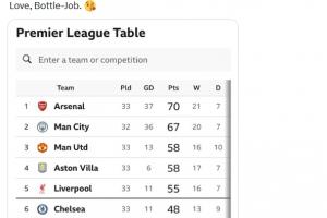 摩根:“所以,阿森納依舊穩居榜首,依然將贏得聯賽冠軍。曼城還是第二,曼聯依然無關緊要;利物浦還是實力只剩去年一半;切爾西依舊一無是處;熱刺依然遲早降級。