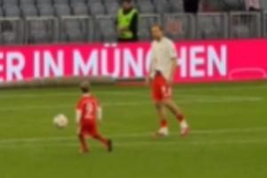人生的幸福時刻??拜仁提前四輪鎖定德甲冠軍后,凱恩和兒子一起在球場踢球??