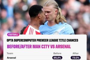 體育資訊04月20日訊 曼城本輪2-1擊敗阿森納,Opta超算賽后更新了英超奪冠概率,阿森納在輸給曼城后仍有73%。