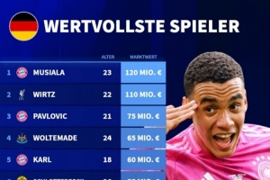 體育資訊3月29日訊 德國轉(zhuǎn)會市場統(tǒng)計了德國球員的身價,并列出榜單,穆西亞拉1.2億歐居首,維爾茨1.1億歐次席。