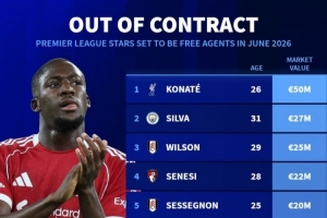 體育資訊3月29日訊 德國轉(zhuǎn)會市場列出了今夏合同到期英超球員身價排名,科納特5000萬歐居首,B席2700萬歐次席。