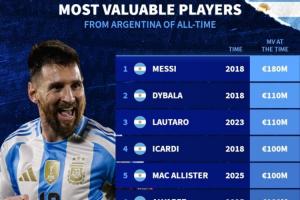 體育資訊3月31日訊 轉會市場網更新了阿根廷歷史身價排行榜,其中,梅西2018年身價1.8億歐元,排名第一,迪巴拉2018年身價1.1億歐第二。
