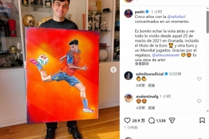 佩德里獲贈一幅畫作,內容為他身穿西班牙國家隊球衣的形象,佩德里社媒曬出這幅畫作,配文:“西班牙國家隊的五年時光,所有回憶凝聚于此刻。回首往事是多么美好,自2021年3月25日在格拉納達的那個日子以來,我們經歷了太多,包括一座歐洲杯冠軍,以及另外一次歐洲杯和世界杯的征程。感謝這份厚禮,這簡直是一件藝術品!”