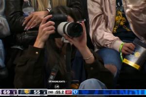 體育資訊3月26日訊 NBA常規賽,步行者對陣湖人,克拉克客串場邊的攝影師。