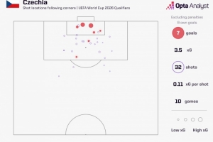 世預賽歐洲區比賽,捷克已經通過角球打進7球,位居歐洲區所有球隊之首。