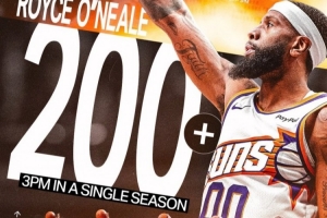 據(jù)太陽官方統(tǒng)計,這是奧尼爾賽季第200記三分,是隊史第六個達到這一成就的球員。