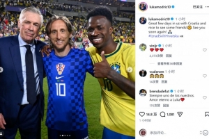 莫德里奇社媒曬出與安切洛蒂、維尼修斯、恩德里克、卡塞米羅的合照,配文:“與克羅地亞隊一起在美國度過了很棒的幾天,很高興見到幾位老朋友,期待很快再次相見!”