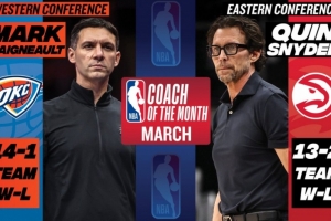 體育資訊4月3日訊 今日NBA官方宣布,雷霆主教練戴格諾特和老鷹主教練斯奈德分別當(dāng)選三月份西部和東部聯(lián)盟月度最佳教練。