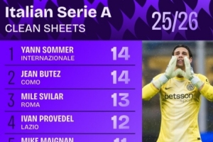 體育資訊4月3日訊 足球數(shù)據(jù)網(wǎng)站Squawka統(tǒng)計(jì)本賽季意甲門將零封榜,索默14次第一,邁尼昂第五,迪格雷戈里奧第七。