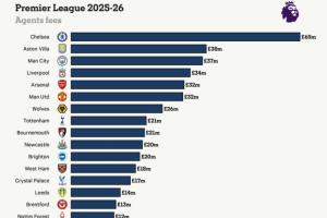 切爾西在本賽季支付了6510萬英鎊的經紀人費用,連續第三個賽季領跑俱樂部榜單。2025-26賽季,切爾西占到了英格蘭足球聯賽92家俱樂部經紀人總支出的12%。