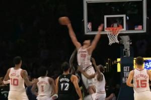火箭森林狼比賽常規時間最后時刻,森林狼發球前犯規,杜蘭特罰球追平,隨后握有絕殺機會,但傳球失誤,森林狼反擊,申京回防高高躍起血帽扇出蘭德爾的上籃,拯救比賽,將比賽拖入加時。